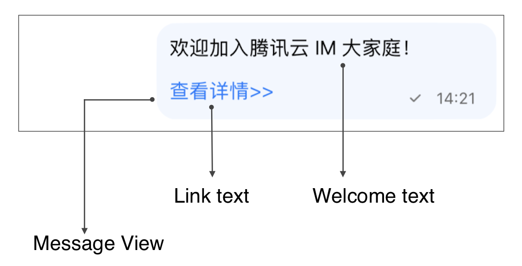 // Self Definition message businessID (Note: Duplicates not allowed)public static final String CUSTOM_LINK_MESSAGE_BUSINESS_ID = "text_link";/** Register the self Definition message with TUIChat. The three parameters are* @param businessID Self Definition message businessID * @param messageBeanClass Self Definition message MessageBean type * @param messageViewHolderClass Self Definition message MessageViewHolder type*/ TUIChatConfigs.registerCustomMessage(CUSTOM_LINK_MESSAGE_BUSINESS_ID,CustomLinkMessageBean.class,CustomLinkMessageHolder.class);